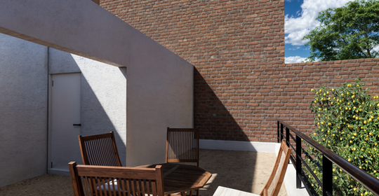 Dado que la mayoría de las construcciones vecinas son autoconstruidas y poco reguladas en cuanto a su volumen de construcción, buscamos hacer una vivienda bien planeada, sobria, cerrada y de baja densidad, con un coeficiente de utilización de suelo que apenas llega al 50% y que está preparada para su crecimiento al tener una estructura diseñada para la conectividad de los posibles futuros espacios con los actuales.