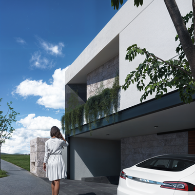 La composición volumétrica destaca por el juego de retranqueos, ventanales verticales y materiales contrastantes —estuco claro, piedra y herrería delgada— que otorgan ritmo, textura y equilibrio a las fachadas.